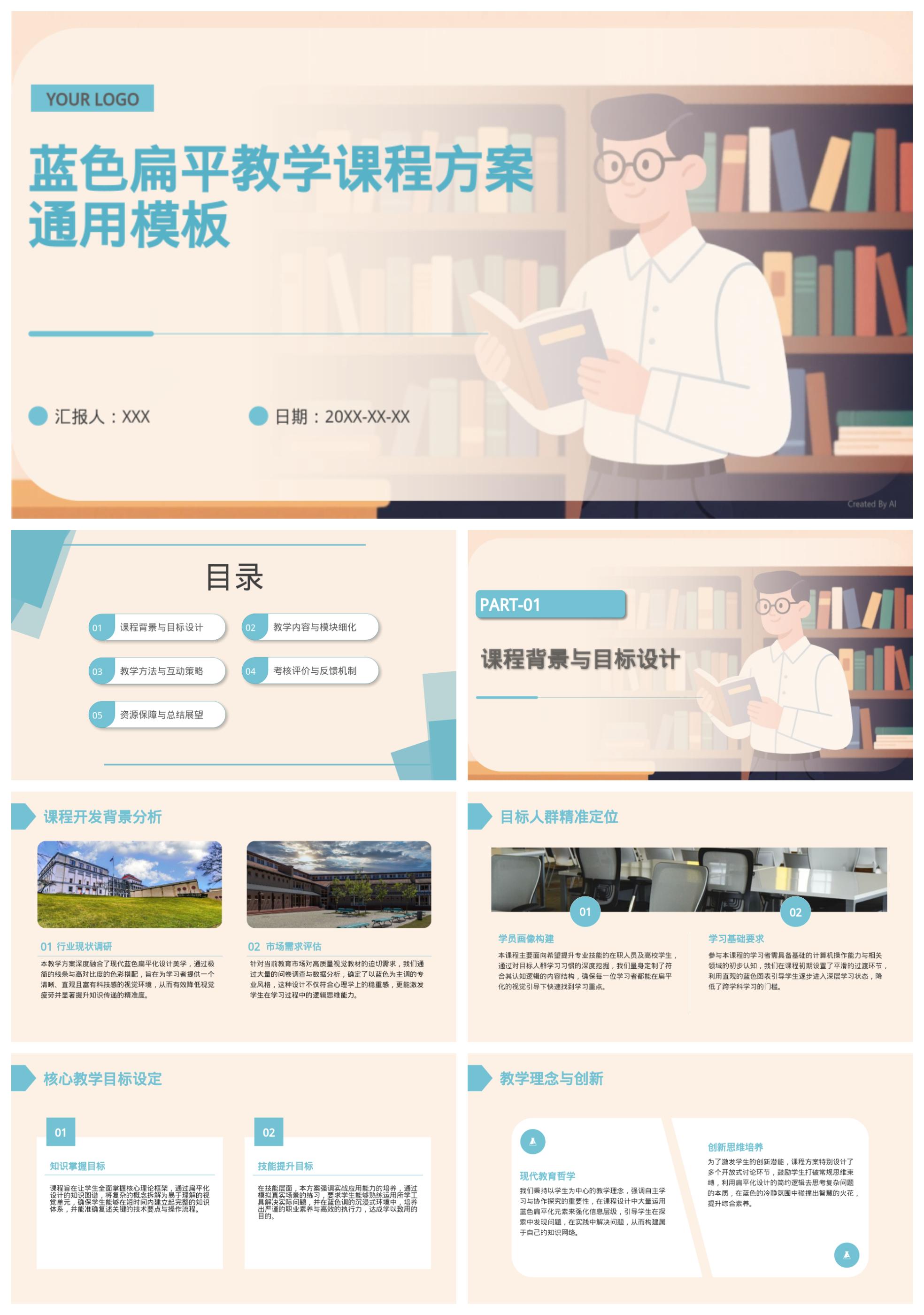 蓝色扁平教学课程方案通用模板